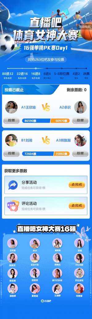 2025年『体育女神大赛』昨日进入16强单挑PK赛阶段,淘汰赛Day1结果如下: